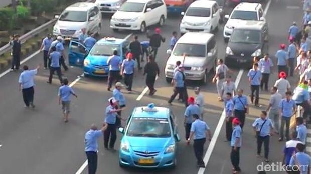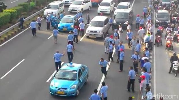 Aksi anarkis ini berlangsung sejak pagi tadi di sekitar jalan tol Dalam Kota. Blue Bird menegaskan, mereka tetap beroperasi, tapi kenyataannya di lapangan, mobil yang membawa penumpang dirazia.