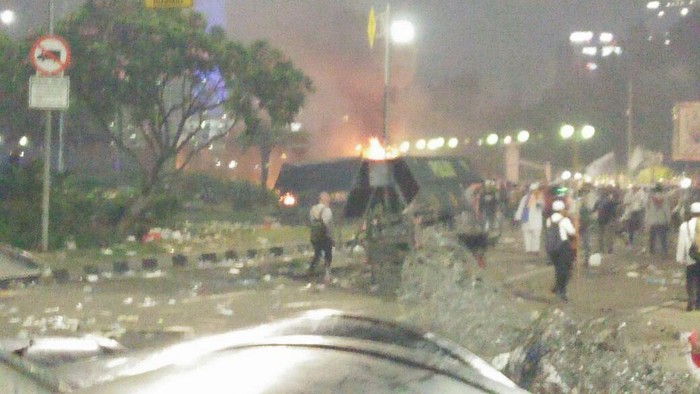 Pantauan di Jl Medan Merdeka Utara, Jakpus, Jumat (4/11/2016), massa makin tidak terkendali. Dua truk Brimob yang diparkir di depan Istana Merdeka dibakar.