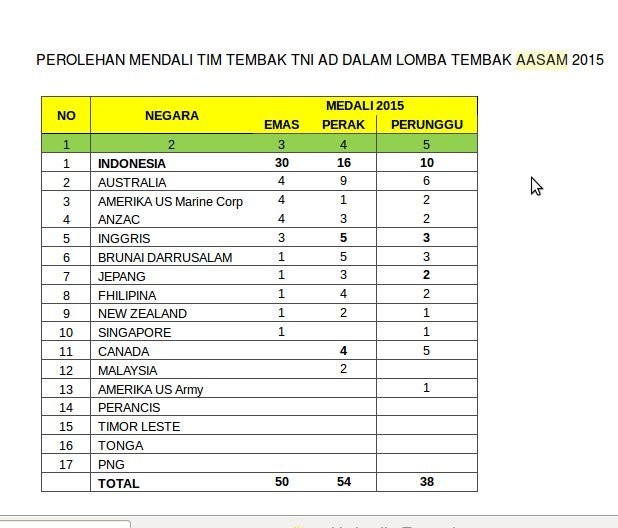 Dalam Australian Army Skill at Arms Meeting (AASAM) 2015, Kontingen Indonesia total menyabet 30 medali emas, 16 perak dan 10 perunggu. Jumlah itu cukup jauh dibanding tim negara lain yang menjadi kompetitor.