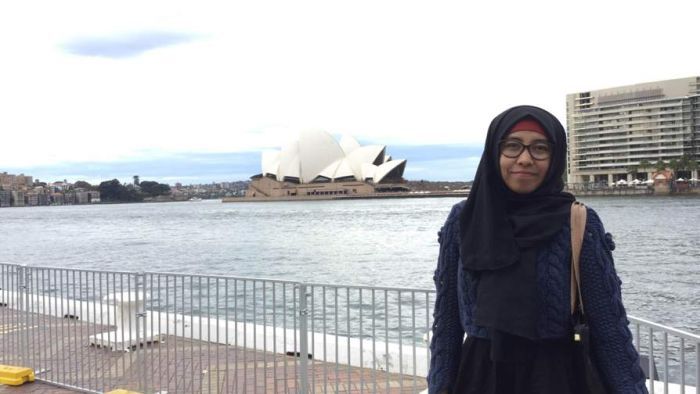 Siti Nurkhasanah di Sydney dengan latar Opera House Foto: Rhiza Caesari