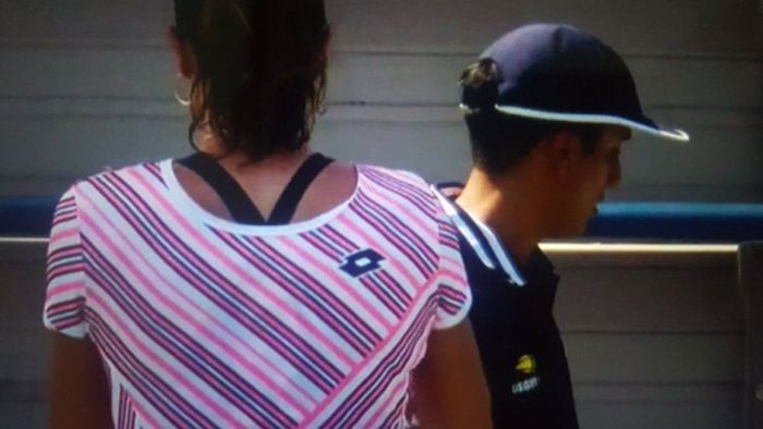 Setelah meletakkan tasnya, ia melangkah ke area teduh di belakang lapangan, meletakkan raketnya di antara kedua kakinya, membalikkan punggungnya membelakangi lawan dan penonton serta dengan cepat mengangkat bagian atas pakaiannya, memperlihatkan bra olahraga hitam dan merah dengan cepat.