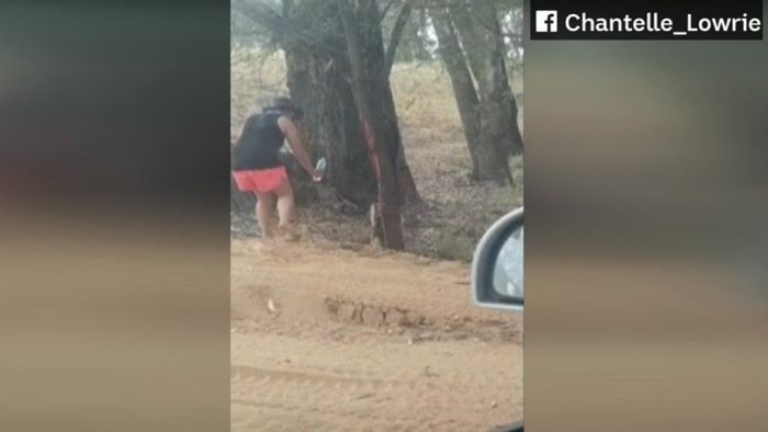 Saat suhu sedang mencapai 44 derajat Celsius, Chantelle Lowrie memperhatikan seekor koala di pinggir jalan tepi Sungai Murray, kawasan Strathmerton.