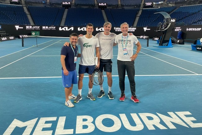 Di akun sosial media miliknya, petenis asal Serbia mengunggah foto sedang berada di tengah lapangan di Rod Laver Arena bersama tim-nya, setelah menyelesaikan latihan pertamanya hari Senin malam.