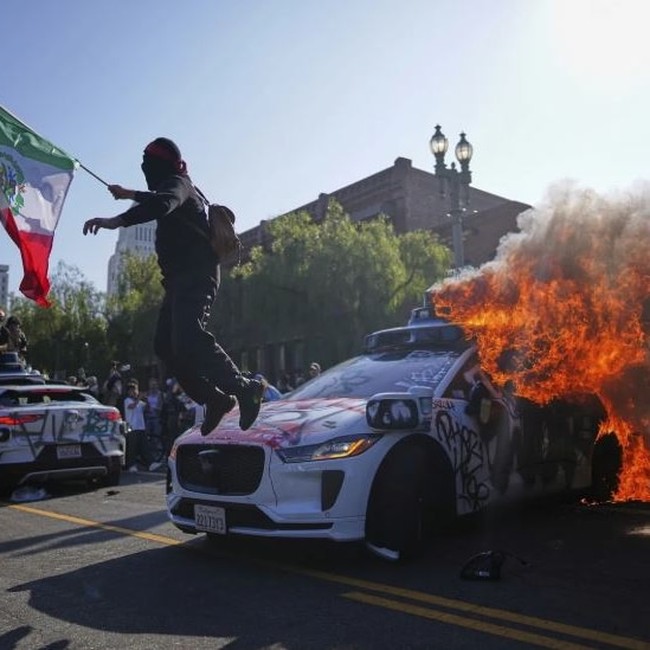 Kerumunan terus bertambah, mobil polisi tampaknya dirusak dan dibakar, sementara polisi menembakkan gas air mata dan peluru karet ke pengunjuk rasa yang berkumpul di luar Pusat Penahanan Metropolitan di pusat kota LA.