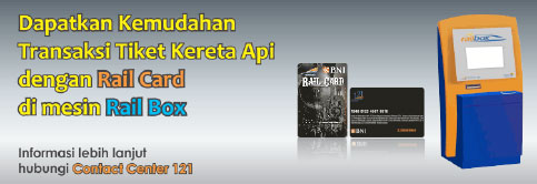 Rail Card adalah kartu prepaid sebagai pengganti uang tunai yang dapat digunakan untuk pembelian tiket KA kelas Eksekutif, Bisnis dan Ekonomi Komersial/AC pada mesin Rail Box selama 24 jam. Cukup dengan menempelkan kartu Rail Card pada mesin Rail Box. Terus ikuti menu yang ada seperti; isi nama KA, stasiun keberangkatan & tujuan,tanggal & jam keberangkatan, dll. Struk kode booking akan Anda dapatkan lalu tukarkan dengan tiket KA di loket stasiun.