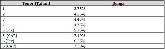 Anda pun bisa memilih tenor yang sesuai dengan kondisi finansial Anda, seperti tabel berikut atau di suku bunga KKB berikut ini: