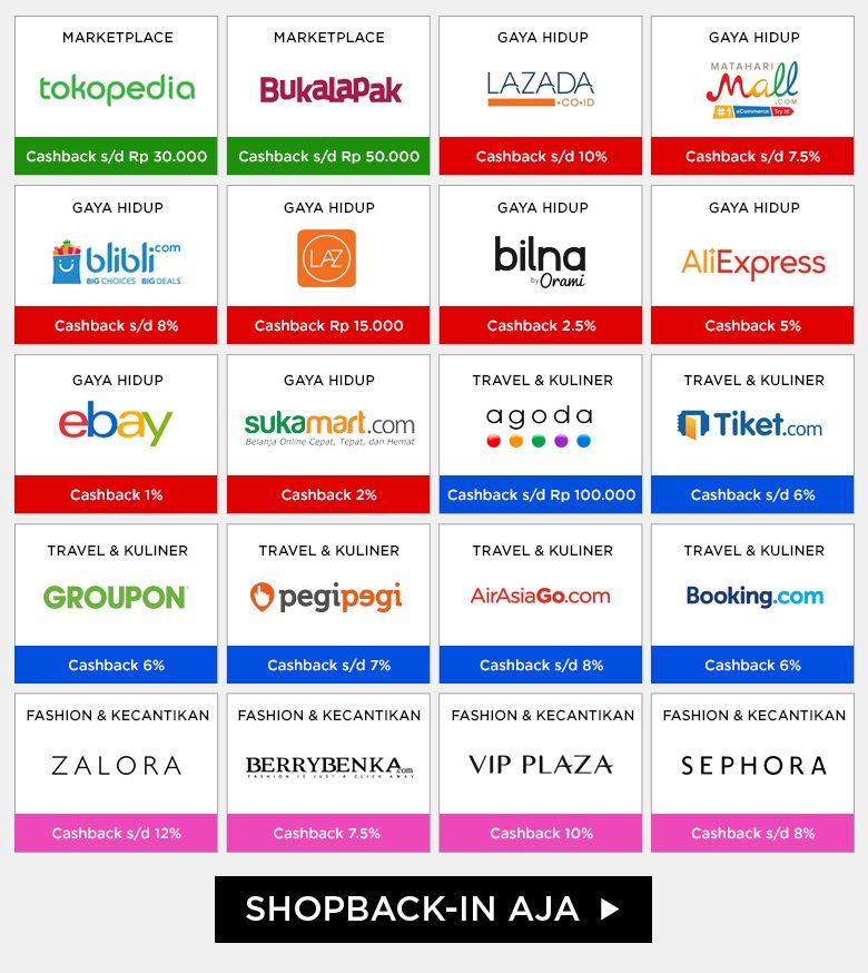 ShopBack.co.idΒ adalah cara paling hemat dan cerdas belanjaΒ online. Situs ini bukanlah situsΒ e-commerceΒ tapi merupakan situs penyedia layanan belanja hemat melaluiΒ cashback, yaituΒ memberikan Anda tambahanΒ cashbackΒ hingga 30% setiap Anda belanjaΒ online!Β ShopBack.co.id telah bekerja sama secara resmi dengan ratusanΒ e-commerce, sepertiΒ Lazada, Matahari Mall,Β Tokopedia,Β Bukalapak,Β Blibli,Β Groupon,Β Zalora,Β AliExpress, Tiket.com,Β Agoda, dan masih banyak lagi.Β E-commerceΒ BuahHatiku.comΒ juga telah bergabung denganΒ ShopBackΒ dan memberikanΒ cashbackΒ 10% untuk semua produk perlengkapan bayi.Β CashbackΒ akan dikirim langsung ke rekening bank Anda. Namun perlu diperhatikan bahwa masing-masing situsΒ e-commerceΒ yang bekerjasama denganΒ ShopBack.co.id menawarkanΒ cashbackΒ dengan jumlahΒ cashbackΒ yang berbeda-beda.
