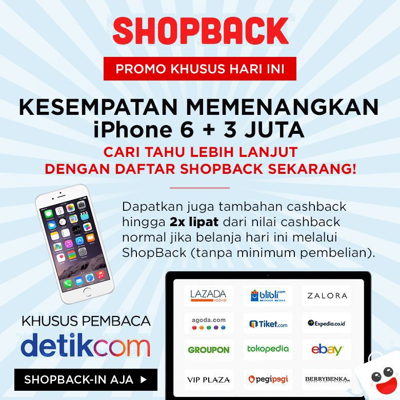 PembacaΒ detikcomΒ yang berbelanja lewatΒ ShopBackΒ hari ini juga akan mendapatkanΒ cashbackΒ hingga dua kali lipatΒ dari nilaiΒ cashbackΒ biasanya. Tidak ada syarat atau jumlah minimum pembelian. SegeraΒ buatΒ akunΒ ShopBackΒ dan nikmati keuntungannya.