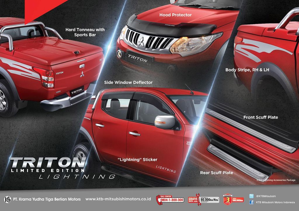 Di GIIAS 2016 kali ini, Mitsubishi memperkenalkan Triton Lightning yang merupakan Triton varian Exceed warna Red Solid dengan paket aksesoris yang fungsional dan sticker eksklusif yang sudah terpasang di body kendaraan. Triton Lightning tersedia dalam jumlah terbatas dan mulai dipasarkan di GIIAS 2016 dengan harga Rp 416.000.000 untuk varian Exceed 4X4 M/T dan Rp 430.000.000 untuk varian.
