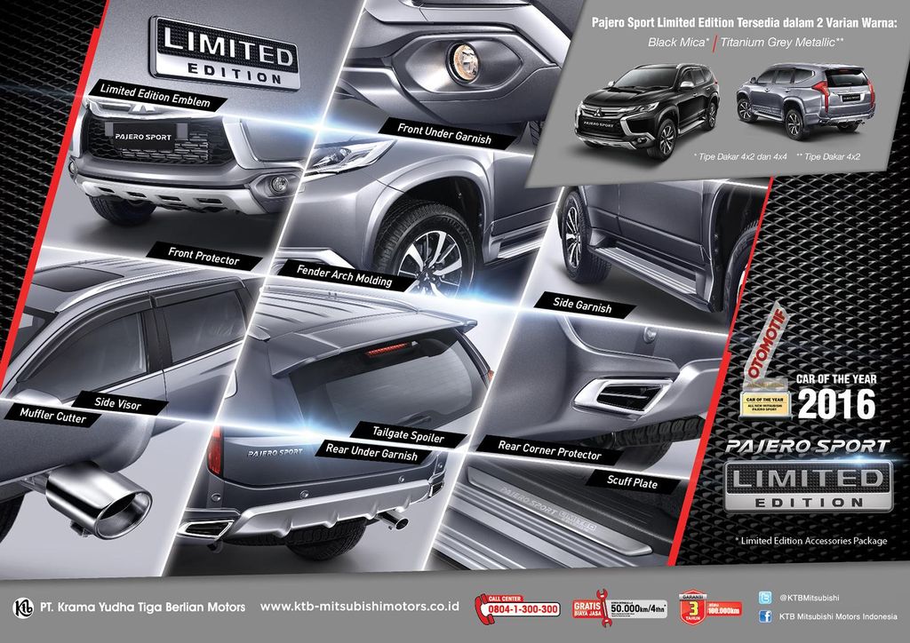 Pajero Sport Limited Edition hadir dengan sebelas item aksesoris pilihan yang sudah terpasang di kendaraan. Aksesoris tersebut merupakan genuine accessories dari Mitsubishi Motors Corporation (MMC) dan beberapa diantaranya tidak dijual terpisah. Pajero Sport Limited Edition tersedia dalam varian Dakar 4X2 dan Dakar 4X4 dengan total sebanyak 2000 unit dan dipasarkan mulai di GIIAS 2016. Pajero Sport Limited Edition menawarkan unit Pajero Sport dengan 11 aksesoris terpilih yang beberapa di antaranya tidak dijual terpisah. Pajero Sport Limited Edition tersedia dalam varian Dakar 4X2 dengan harga Rp 512.000.000 dan Dakar 4X4 dengan harga Rp 639.000.000 (On The Road Jabodetabek).