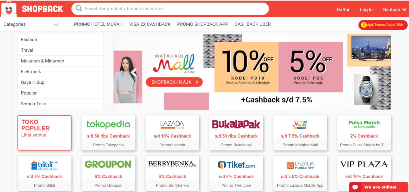 ShopBack adalah outlet mal, setiap belanja di lebih dari 90 lebih toko online yang ada di dalam mal ShopBack, Anda akan diberi tambahan Cashback hingga 30%. Selain cashback, ShopBack juga selalu memberikan promo eksklusif, voucher, kode kupon, dan diskon yang tidak bisa didapatkan di situs lainnya.