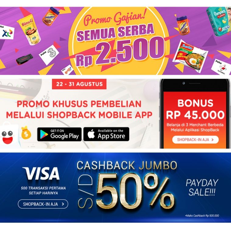 - Promo ShopBack Mobile App Bonus Rp 45.000. (Belanja di 3 toko online melalui aplikasi ShopBack dapat Rp 45.000)