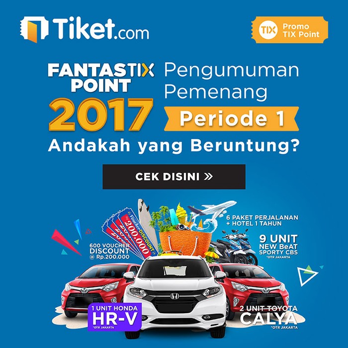 Setelah pemenang program Fantastix Point 2017 periode pertama diumumkan, masih akan digelar pengundian program Fantastix Point 2017 untuk 2 periode selanjutnya. Pemenang di 2 periode selanjutnya juga akan mendapatkan beragam hadiah menarik dari Tiket.com.