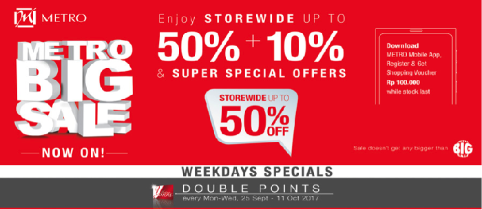 PT Metropolitan Retailmart kembali menggelar promo METRO BIG SALE 2017 mulai 19 September 2017. Para shopaholic akan dimanjakan dengan promo besar-besaran hingga 50 persen melalui METRO BIG SALE.