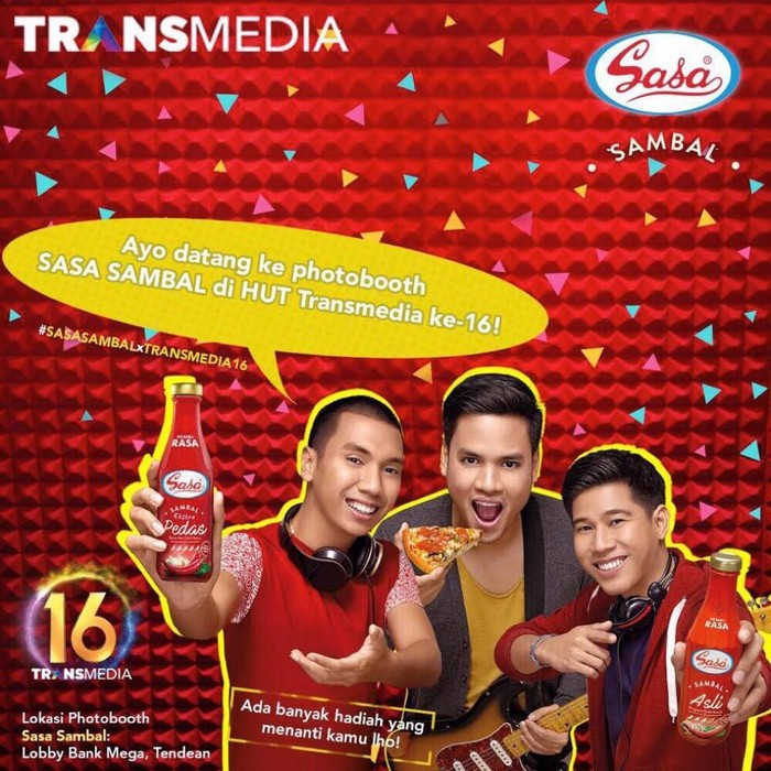 Kamu pun bisa makin dekat dengan mereka? Datang saja ke booth Sasa Sambal yang ikut meramaikan HUT ke-16 Transmedia. Di sini kamu yang sudah beli Sasa Sambal di Transmart bisa berfoto bareng RAN sekaligus dapat hadiah menarik lho! Untuk mendapatkan hadiah itu kamu harus ikutan foto di booth Sasa Sambal dan follow Instagram @transtv_corp @officialtrans7 @kreasisasa.
