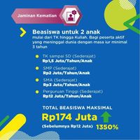 Manfaat JKM juga meliputi bantuan beasiswa, yang juga mengalami perubahan dengan poin-poin yang sama dengan manfaat JKK, yaitu maksimal mencapai Rp 174 juta untuk dua orang anak.