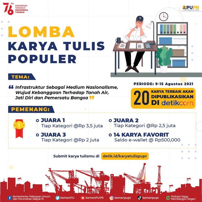 Dalam rangka menyambut HUT ke-76 RI, Kementerian PUPR menggelar lomba karya tulis bertema 'Infrastruktur Sebagai Medium Nasionalisme, Wujud Kebanggaan Terhadap Tanah Air, Jati Diri dan Pemersatu Bangsa'. Melalui lomba ini, Sahabat PUPR dan Detikers dapat ikut merayakan momen kemerdekaan melalui karya tulisdan berkesempatan mendapatkan hadiah jutaan rupiah. Berikut mekanisme, syarat, dan ketentuan lomba.