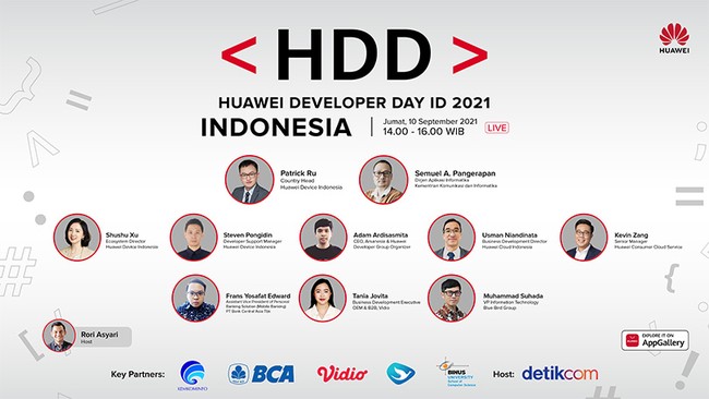 Selain itu, Assistant Vice President of Personal Banking Solution (Mobile Banking) at PT Bank Central Asia Tbk, Frans Yosafat Edward, Kemudian, Business Development Executive - OEM & B2B, Vidio, Tania Jovita, VP Information Technology Blue Bird Group, Muhammad Suhada. Mereka akan menceritakan pengalaman mereka melakukan pengembangan aplikasi pada platform HMS dan kerjasama strategis dengan HUAWEI.