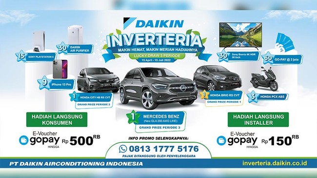 Di sisi lain, promosi ini juga menawarkan peluang mendapat satu dari ratusan hadiah undian dengan grand prize satu mobil mewah di tiap periodenya bagi pembeli AC inverter Daikin. Berlaku bagi pembelian AC Daikin inverter dari berbagai toko elektronik maupun platform penjualan daring. Untuk informasi selengkapnya terkait program ini, Daikin telah menyiapkan tautan khusus https://www.daikin.co.id/daikin-inverteria.