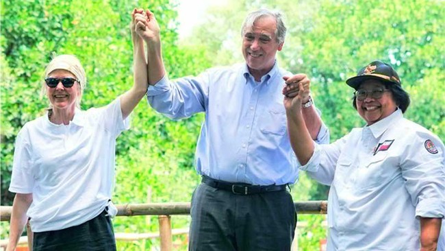 Menteri Lingkungan Hidup dan Kehutanan (LHK) Siti Nurbaya bersama dengan Delegasi Kongres AS melakukan penanaman mangrove di Taman Wisata Alam (TWA) Angke Kapuk, Jumat (12/4) yang lalu. Dalam kegiatan ini, Delegasi Kongres AS juga menerima penjelasan terkait proses rehabilitasi pesisir sekitar TWA.
