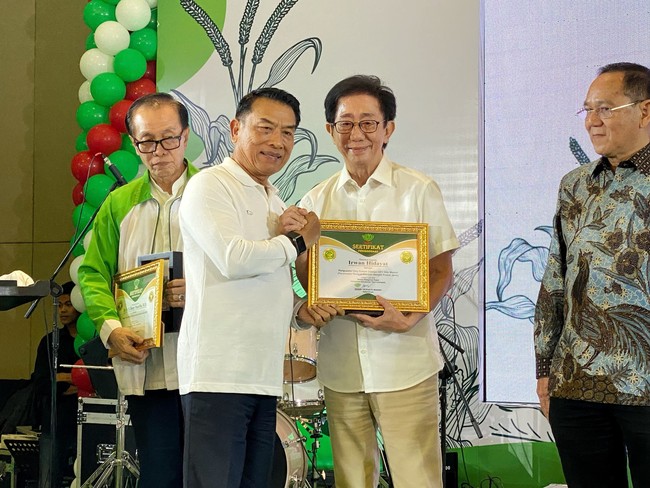 Penghargaan diserahkan Ketua Umum HKTI Jenderal TNI (Purn) Moeldoko pada acara perayaan hari ulang tahun (HUT) HKTI ke-50 di Discovery Hotel, Ancol, Jakarta Utara, Rabu (7/6/2023).