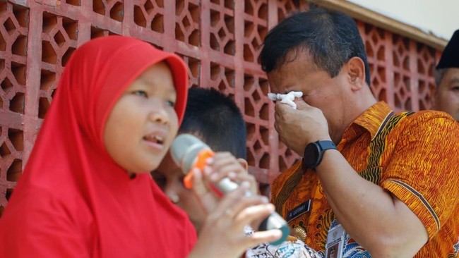 Menjelang akhir kunjungan, seorang peserta didik berjalan menghampiri Ahmad Luthfi dengan dipapah oleh seorang guru. Ya. peserta didik itu bernama Najwa.