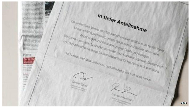 Lufthansa dan Germanwings mem.asang iklan duka sehalaman penuh di koran-koran Jerman