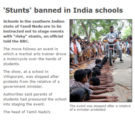 Lalu ada foto lain yang banyak dibagikan, terutama di India dan Pakistan, menunjukkan tangan siswa sekolah digilas oleh sepeda motor. Ini sebenarnya aksi yang dilakukan pelatih seni bela diri di India selatan.