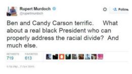 Pada Rabu (7/10), Murdoch mengatakan lewat akun Twitternya, "Ben dan Candy Carson luar biasa. Bagaimana dengan seorang presiden kulit hitam yang sebenarnya yang bisa mengatasi ketegangan antar-ras? Dan banyak hal lain."