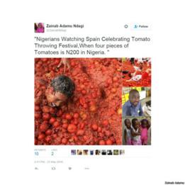 Salah satu meme yang beredar di media sosial di Nigeria menggambarkan wajah muram warga Nigeria dan di sisinya festival tahunan di Spanyol yang memperlihatkan atraksi saling lempar tomat.