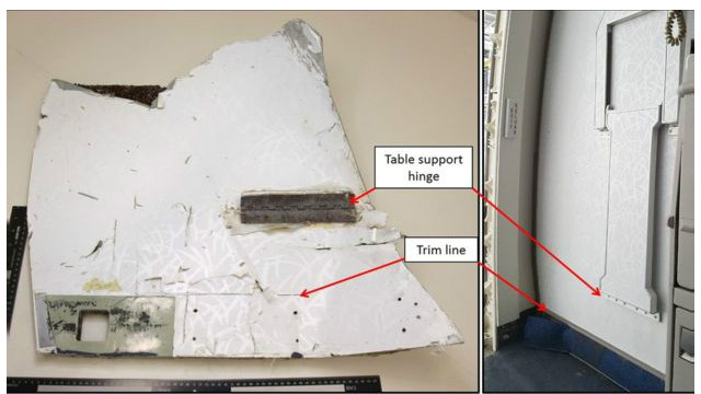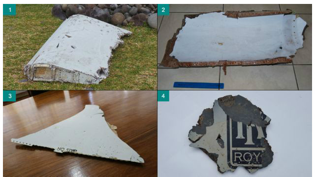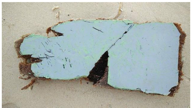 1. Salah satu bagian sayap pesawat, ditemukan di Pulau Reunion pada Juli 2015. Telah dikonfirmasi berasal dari MH370.