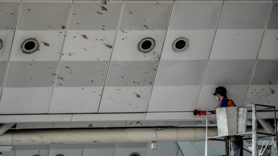 Petugas bandara membersihkan bekas-bekas darah korban serangan bom bunuh diri.
