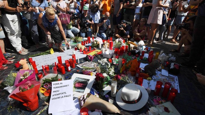 AFP/PASCAL GUYOT Warga menyatakan duka di La Rambla, yang menjadi sasaran serangan mobil barang yang menewaskan sedikitnya 13 orang.Berapa orang yang sudah ditangkap?