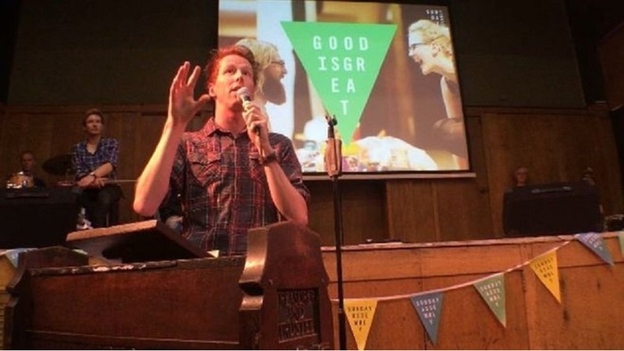 Tamsin tidak beragama namun dia bergabung dengan sebuah perkumpulan jemaat sekuler. (BBC)Tamsin, seorang wartawan berusia 26 tahun, menghadiri Majelis Minggu, sebuah perkumpulan jemaat sekuler yang bertemu di London setiap dua minggu sekali.