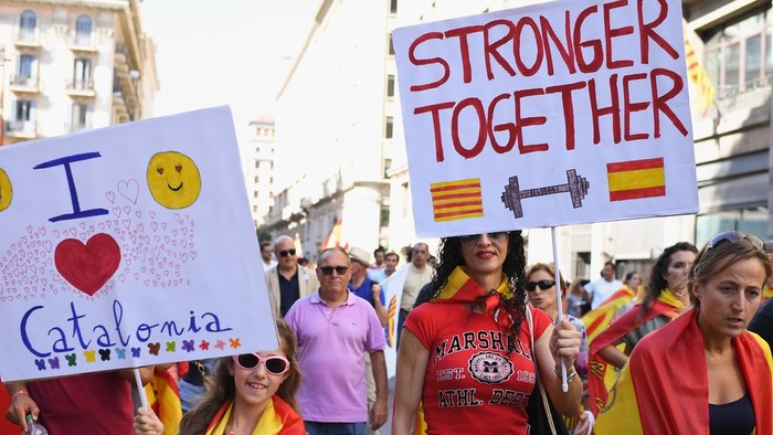 Demonstrasi propersatuan diperkirakan sama besarnya dengan protes mendukung pemisahan diri Catalunya. (Jeff J Mitchell/Getty Images)