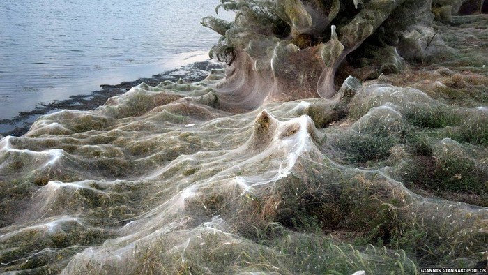 Jaring laba-laba jenis Tetragnatha itu menutupi areal tanaman sepanjang 300 meter di pinggir pantai kota Aitoliko, seperti dilaporkan Daily Hellas.