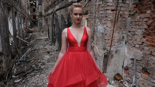 Foto remaja perempuan Ukraina dengan baju pesta berwarna merah menyala di lorong sekolah yang luluh lantak karena serangan Rusia viral di media sosial.