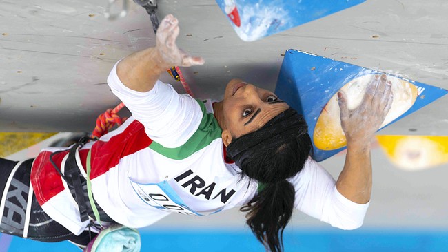 Elnaz Rekabi menggunakan jilbab saat kejuaraan panjat tebing dunia di Paris pada 2016. (AFP)
