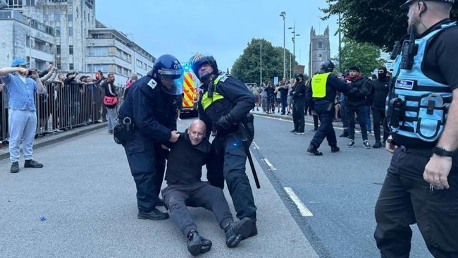 Pada Senin (05/08) malam, polisi diserang oleh massa di Plymouth ketika mereka berupaya memisahkan pengunjuk rasa, sementara bom molotov dilemparkan ke petugas polisi di Belfast dan polisi menghadapi demonstrasi di Birmingham.