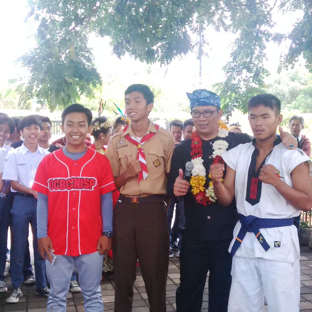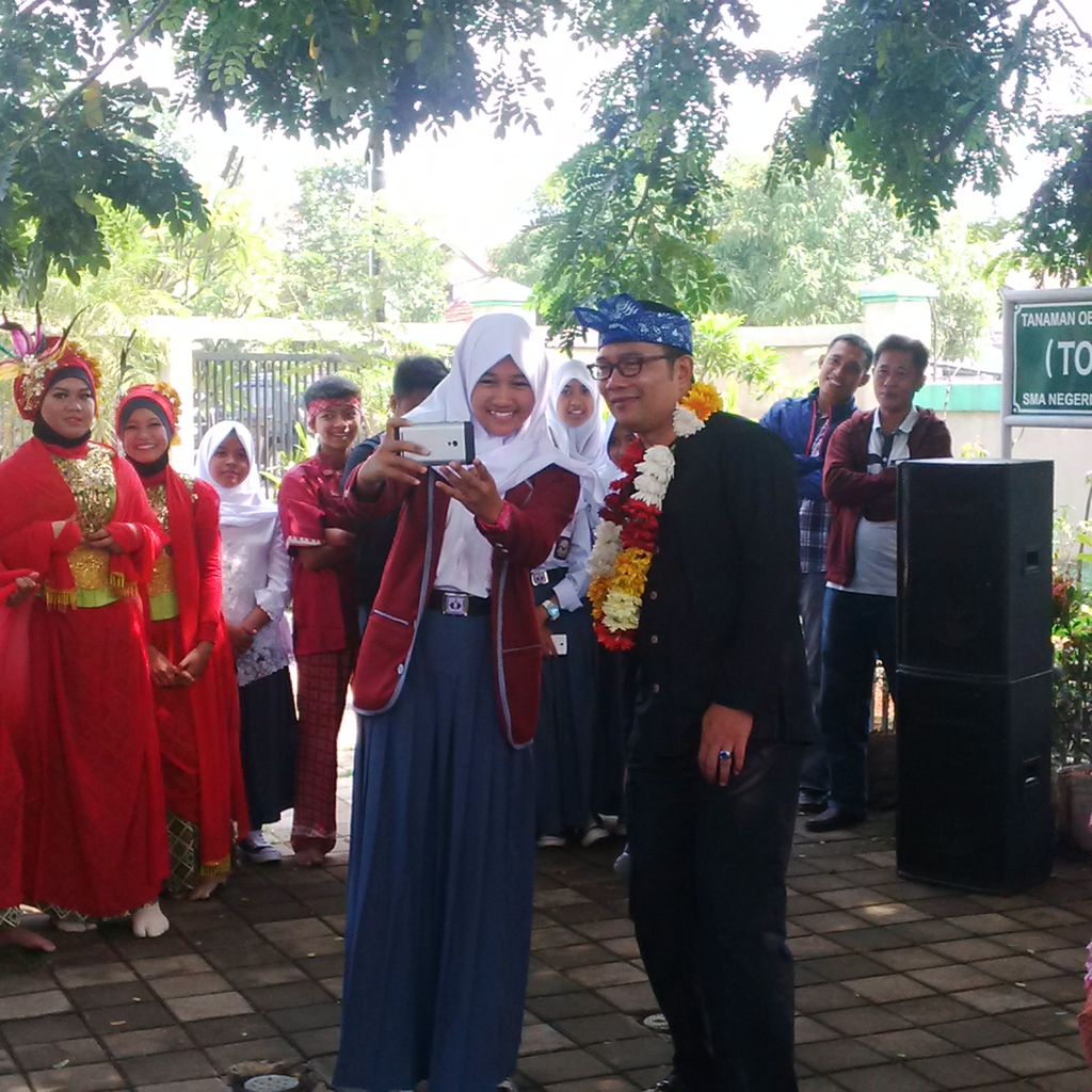 "Coba saya mau ngetes, siswa-siswi SMAN 27 ini apakah badannya sehat. Saya mau nantang push up 50 kali, siapa yang berani? Hadiahnya selfie," tantang Emil.
