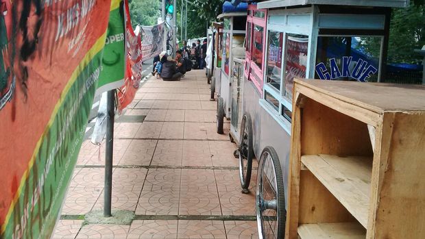 Dengan membawa gerobak dagangannya yang ditaruh di trotoar, para pedagang menginap. Mereka menggelar tikar dan membuat atap dari terpal di samping trotoar.