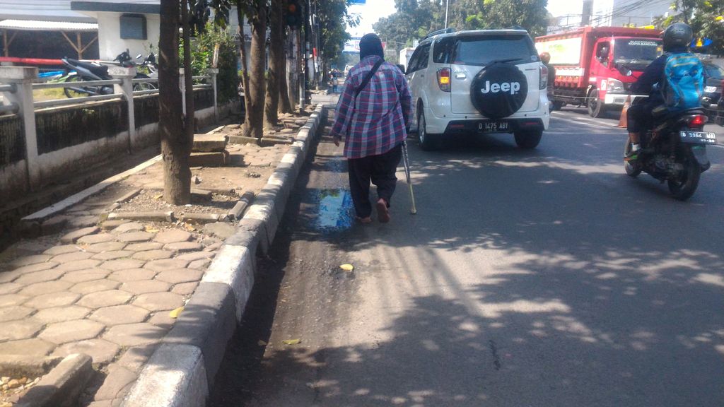 Kawasan Buahbatu, misalnya. Terlihat seorang wanita berjalan menggunakan satu tongkat penyangga kaki kanannya sambil mendekati pengemudi roda empat yang hendak keluar dari area parkir. Dia mengemis.