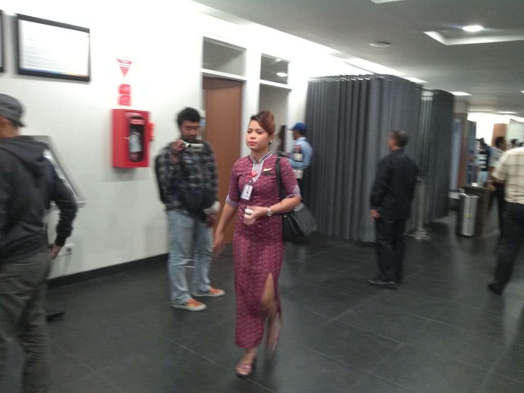 Wajahnya tidak memperlihatkan sebuah kecemasan atau keterpaksaan menjalani tes urine tersebut. Raut wajah yang sama masih ditunjukannya setelah pemeriksaan dilakukan. Dengan mengenakan pakaian merah marun bermotif batik, pramugari itu lantas kembali melanjutkan pekerjaannya.