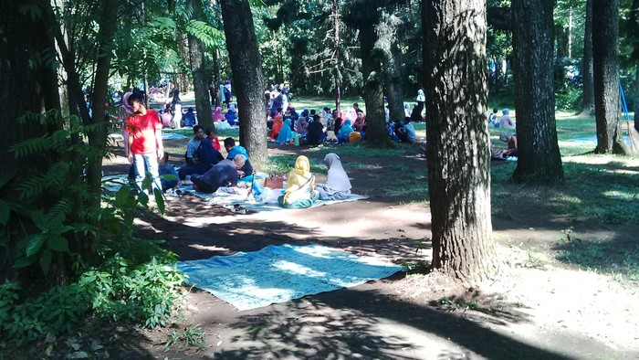 Di beberapa sudut, tampak sejumlah keluarga yang bersantai di bawah pohon rindang. Mereka juga membawa bekal untuk santap siang bersama.