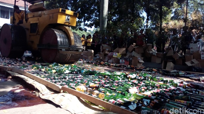 Kegiatan pemusnahan 4.000 botol miras yang digilas menggunakan kendaraan alat berat ini dipimpin langsung Bupati Garut Rudy Gunawan. Turut hadir Kapolres Garut AKBP Novri Turangga dan Dandim 0611 Garut Letkol Arm. Setyo Hani.