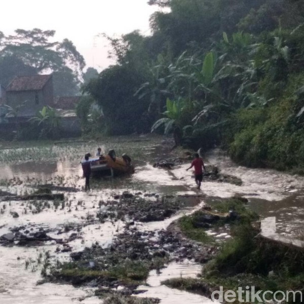 Selain rumah, puluhan kendaraan milik warga juga banyak yang terseret dan ditemukan dalam kondisi rusak tergenang air. Bahkan beberapa kendaraan ditemukan di tengah-tengah area persawahan milik warga. Salah satunya adalah kendaraan roda empat milik warga Perumahan Cijati Asri, Syamsul (43).