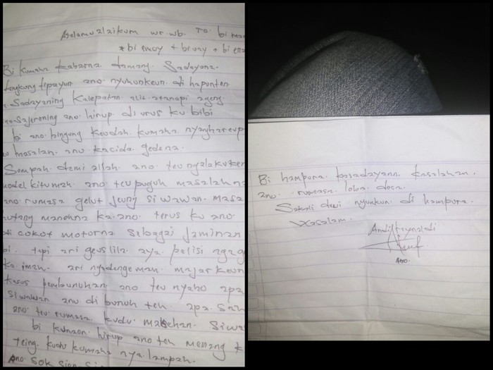 (Bi, bingung harus bagaimana menghadapi masalah yang begitu besar ini, sumpah Demi Allah Ano tidak melakukan hal seperti itu. Ano gak helas masalahnya, Ano merasa berkelahi dengan si Wawan masalah hutang dia ke Ano. Terus motor dia diambil sebagai jaminan, begitu bi