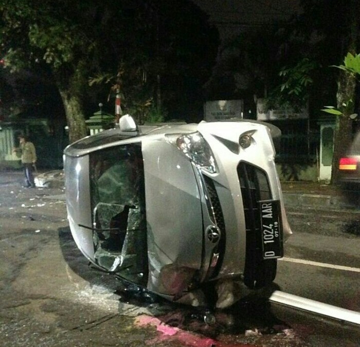 Insiden tergulingnya mobil Toyota Avanza silver nopol D 1024 AAR itu berlangsung di Jalan Sumbawa, Kota Bandung, Jabar, Sabtu (12/8/2017), sekitar pukul 02.30 WIB.