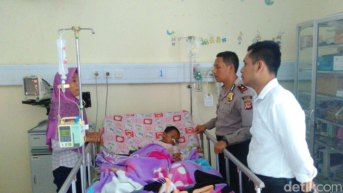 Wakapolres Cirebon, Kompol Wadi Sa'bani beserta jajarannya menjenguk keempat korban di Rumah Sakit Mitra Plumbon Cirebon, Senin (4/9/2017). Dikatakan Wadi, kondisi kesehatan korban yang selamat sudah mulai menunjukan adanya perkembangan yang cukup baik. Namun, korban masih harus mendapatkan perawatan intensif.