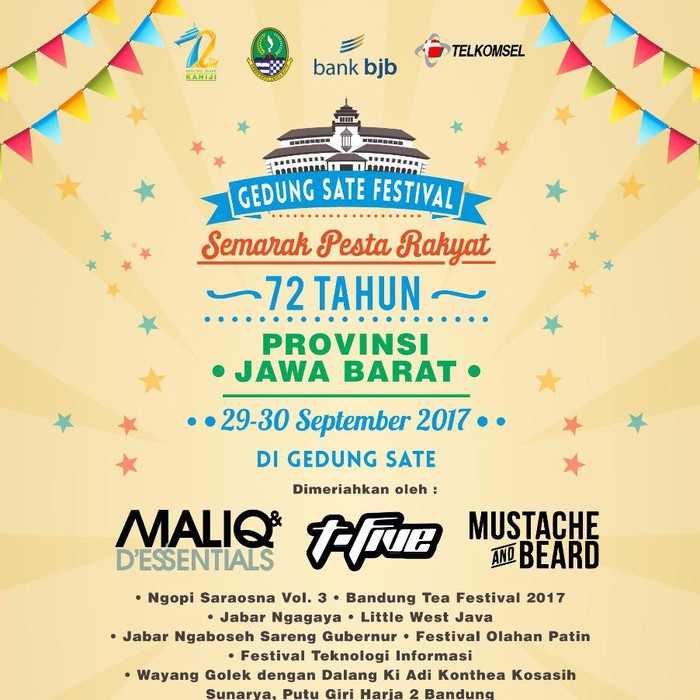 HUT ke-72 Jawa Barat tahun ini diberi nama Gedung Sate Festival dengan mengusung tema 'Semarak Pesta Rakyat' yang digelar di sekitaran Gedung Sate. Kegiatan ini digelar selama dua hari mulai Jumat (29/9/2017) sampai Sabtu (30/9/2017) besok.